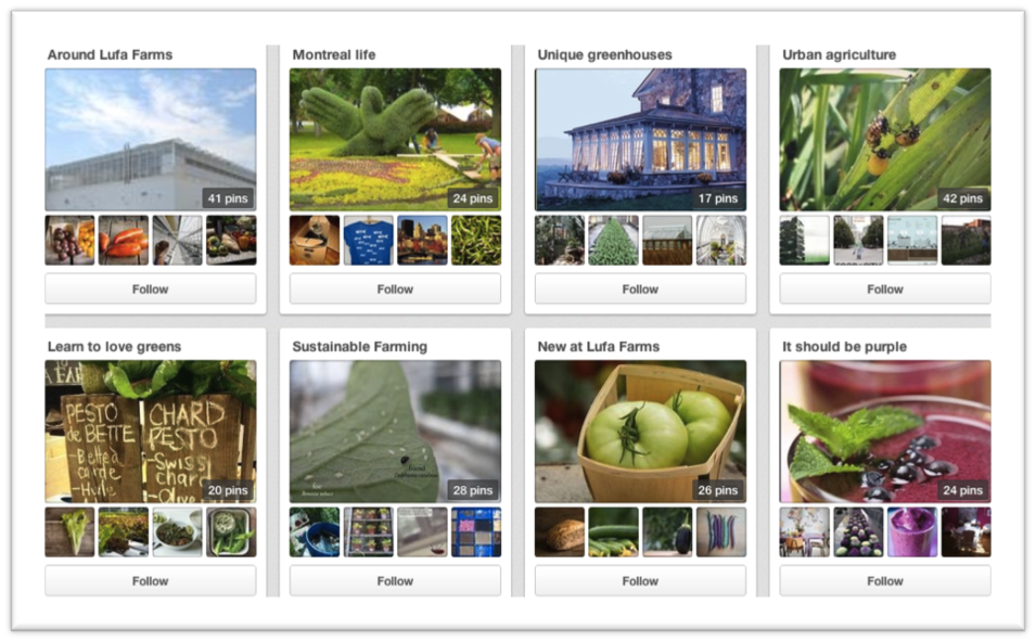 There are only two boards with Lufa Farms in the title, as being overly self-promotional discourages pinners from following brands. In addition to adding their location, Lufa Farms goes a step further by dedicating an entire board to their hometown Montreal in order to increase discoverability.
