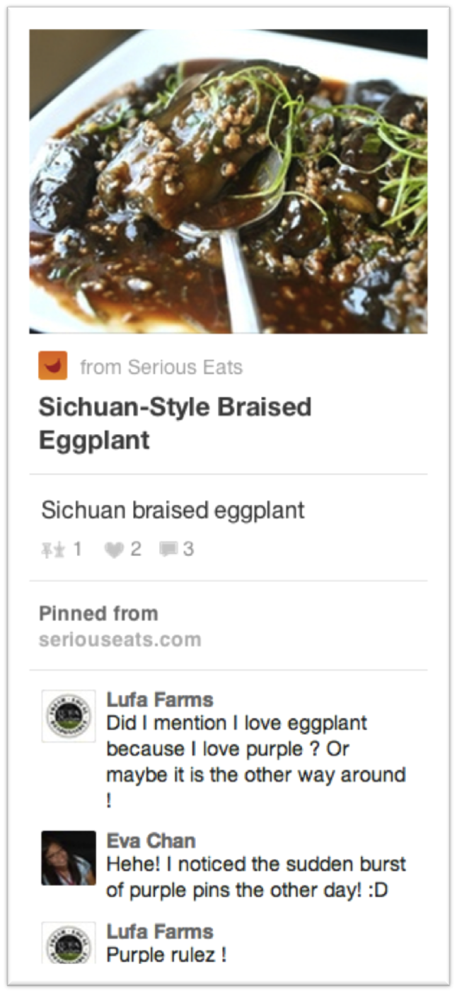 Unlike many brands on Pinterest, Lufa Farms actually takes the time to like and comment on images from other pinners. This is a great way to increase engagement and obtain additional followers, especially pinners that are already pinning content from the Lufa Farms site.