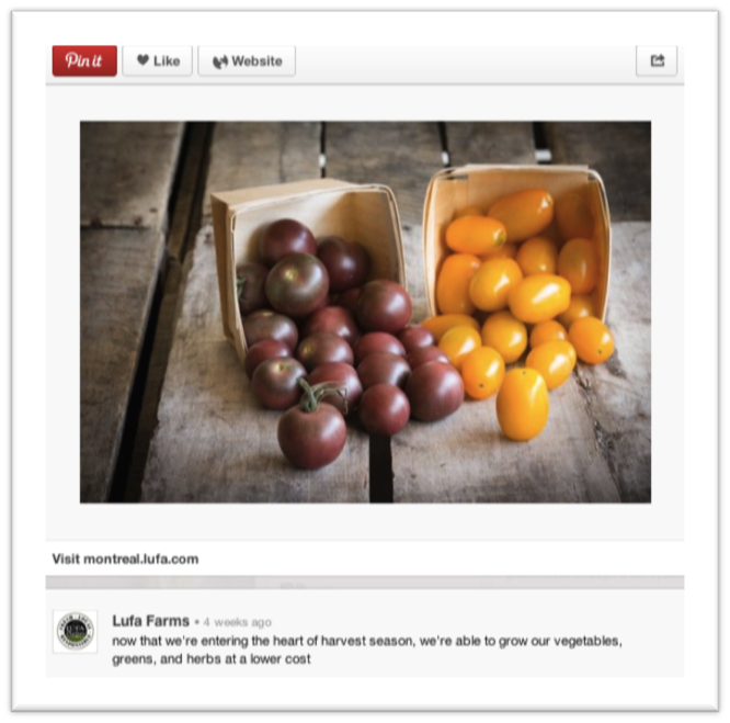 Brand consistency across every channel is crucial; however, you should also take advantage of the features only available on Pinterest. Lufa Farms has taken care of the basics, but a verified site and frequent updates from a variety of sources will ensure they get the most out of their investment.