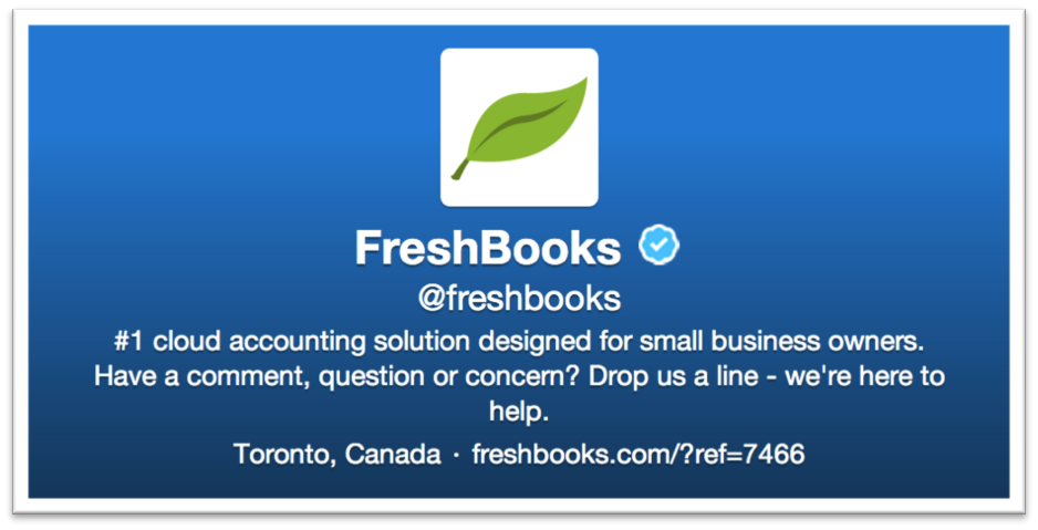 Twitter’s profile pictures are pretty small, and appear even smaller in the feed. Instead of the FreshBooks’ text logo, their profile picture is of the green leaf which also appears as the favicon on the FreshBooks website. The green leaf is quickly recognized, and the full logo appears on FreshBooks’ customized background image.